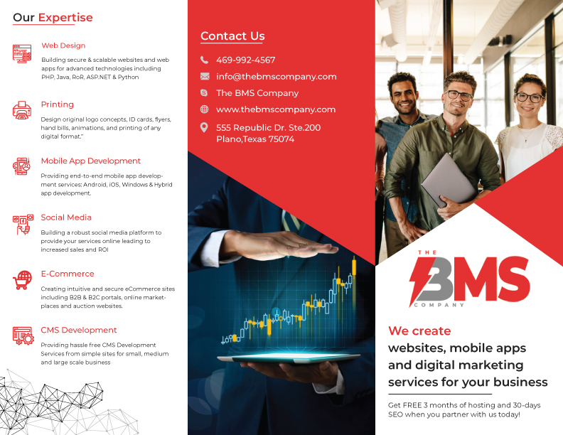 In terms of providing complete business solutions, along with being a top web and app development company, BMS Printing, a subsidiary of The BMS Company is offering printing services from custom shirts to banners, jerseys to brochures, business cards to promotional items; we got your B2B PRINTING needs covered!